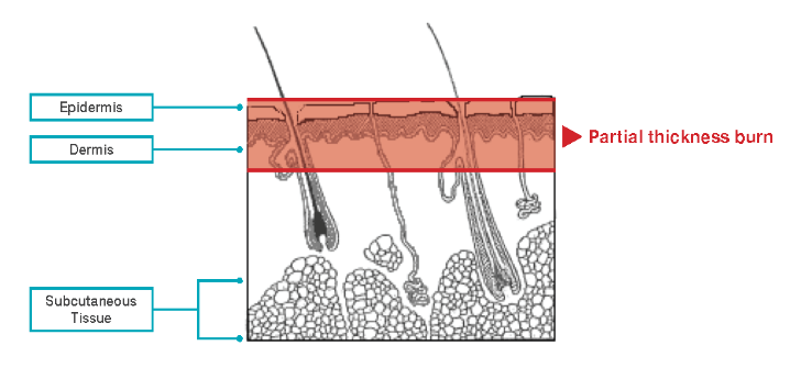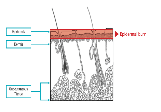 Superficial thickness burn Burns affect the outer layer or epidermis. Common symptoms include localised redness and pain.